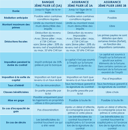 S’agissant de la prévoyance vieillesse privée, on distingue entre le pilier 3a et le pilier 3b : – pilier 3a – prévoyance individuelle liée ouverte aux salariés comme aux travailleurs indépendants: Les versements sont déductibles du revenu imposable dans la limite d’un plafond. Il s’agit d’une forme de prévoyance liée, ce qui signie que l’avoir n’est disponible qu’à certaines conditions.